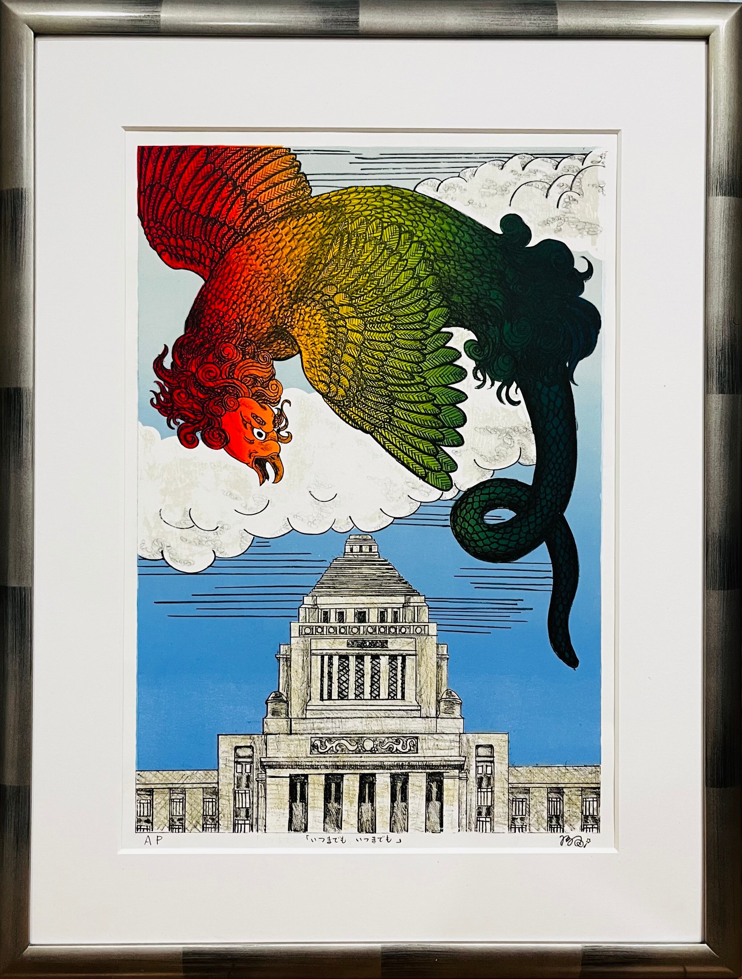 私の作品では国会議事堂の上を飛ばせ、津波の原発事故や東日本大震災などの震災が起こった年で、政府の対応の遅さを風刺した作品となっています。