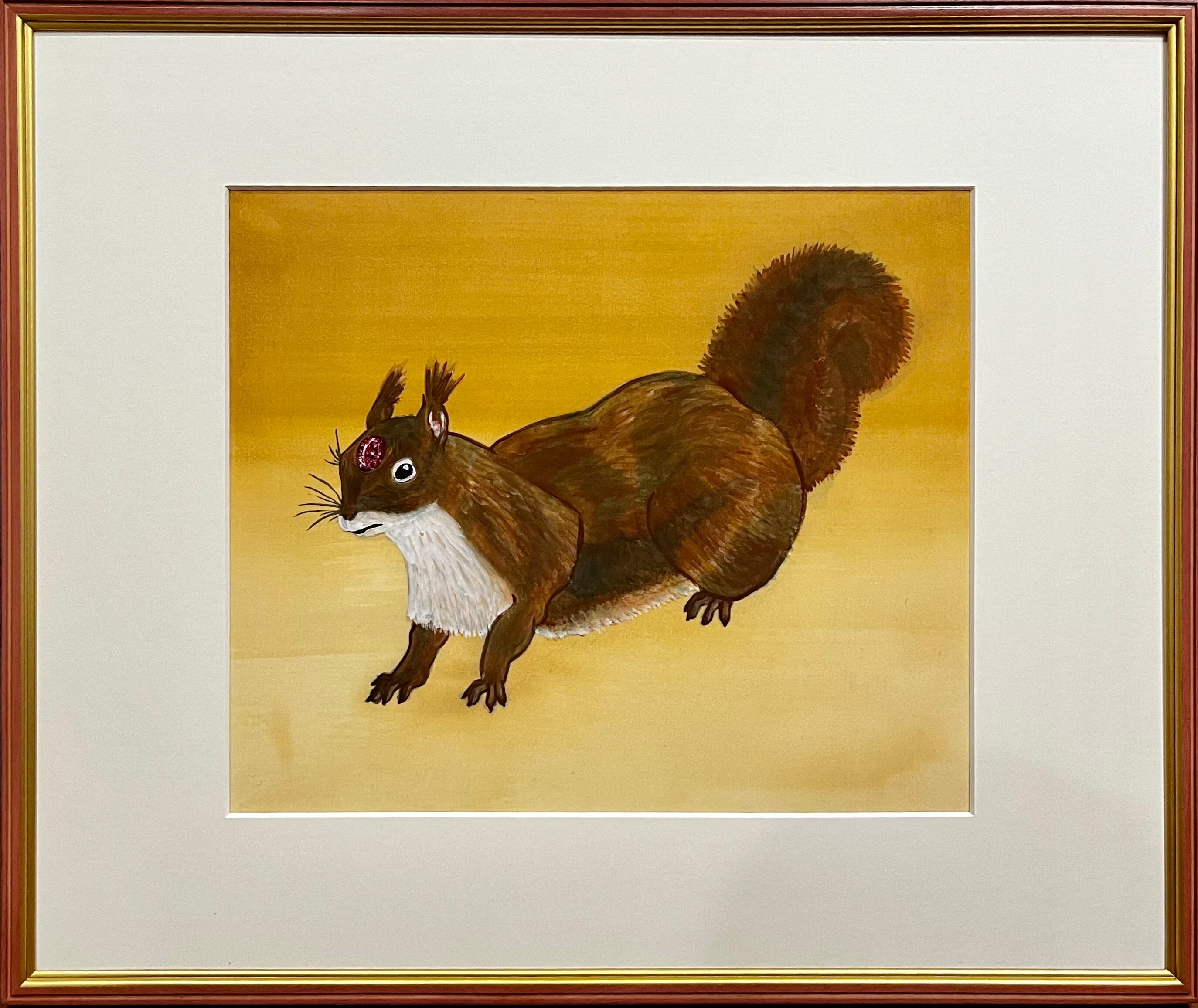 「カーバンクル」とはガーネット(ザクロ石)のことで、スペインが発祥となりパラグアイで目撃したという伝説の小動物です。私はリスの額にガーネットを埋め込んで表現しました。